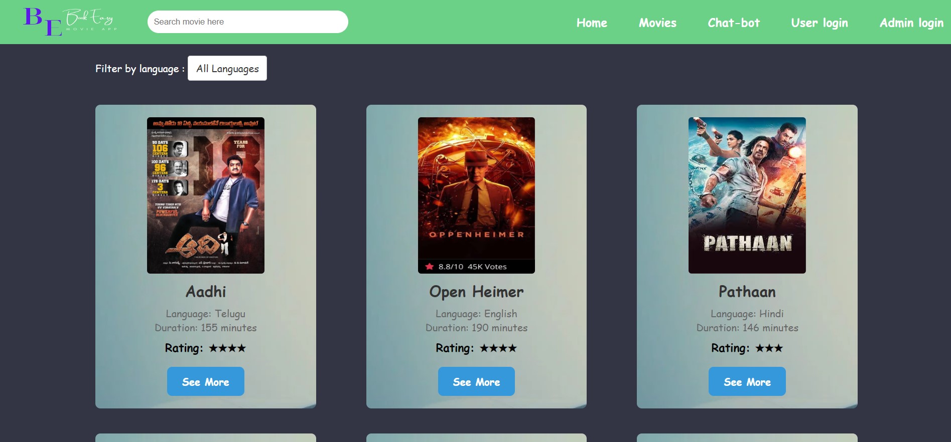 - Click on the provided Vercel link. Start using the app for hassle-free online booking of movies and live events. Please note that the backend is hosted on Render, and the added data may be removed after some time due to Render's rules and limitations.