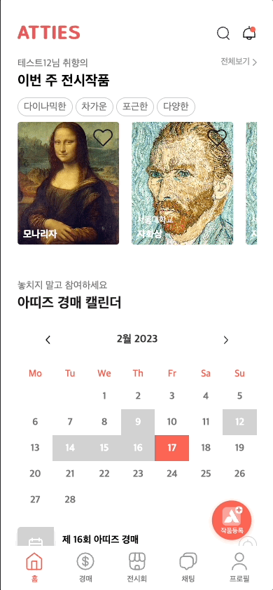 | 픽 리스트, 찜 리스트 | 홈 화면 | 전시회 화면 |