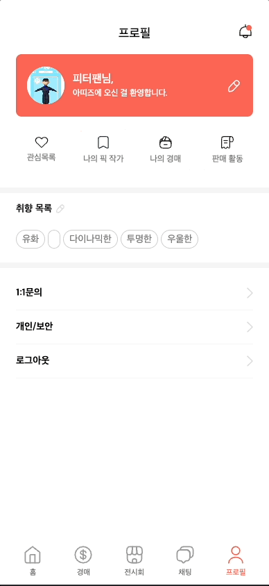 | 1대1 문의 | 나의 경매, 판매 활동 | 비밀번호 변경, 회원 탈퇴 |