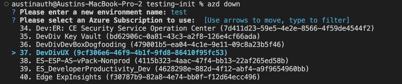 | "no environment selected. Run \"azd env select\" to set a default environment, or \"azd down -e <name>\" to target a specific environment", | |