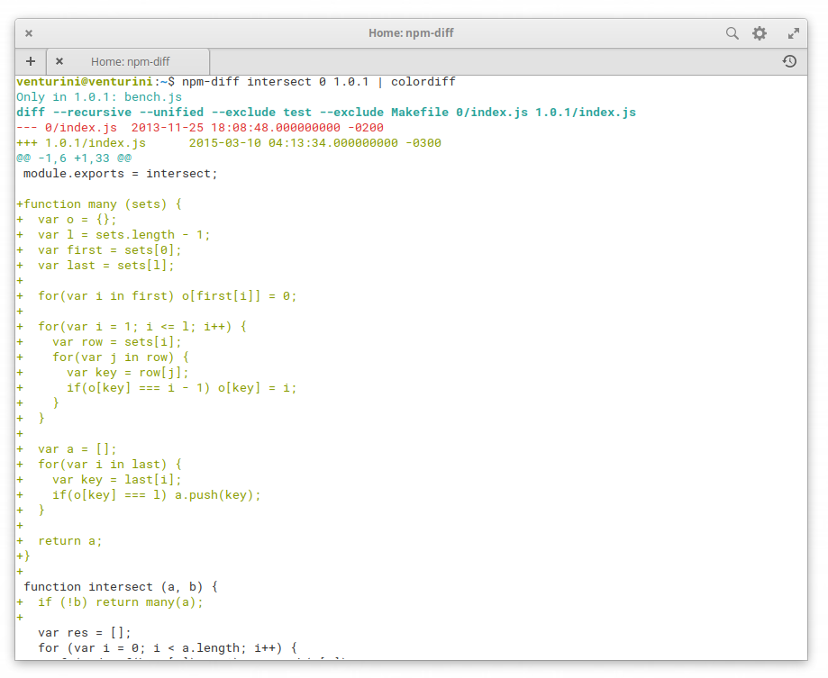 $ npm-diff intersect 0.0.0 0.1.0 | colordiff | less -RIf you don't have colordiff, and want to use it (on the Linux, use sudo; in the Mac, don't use):