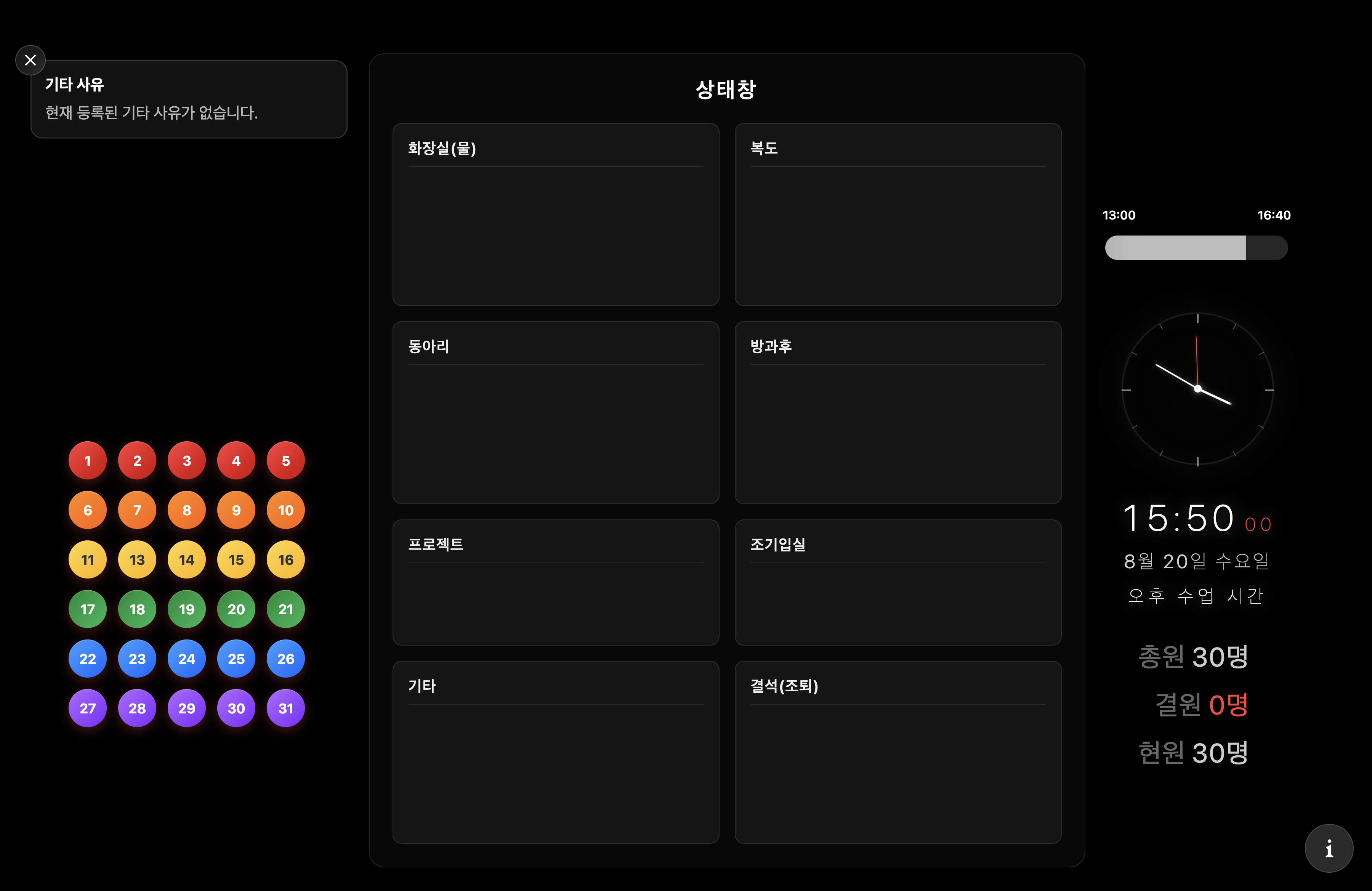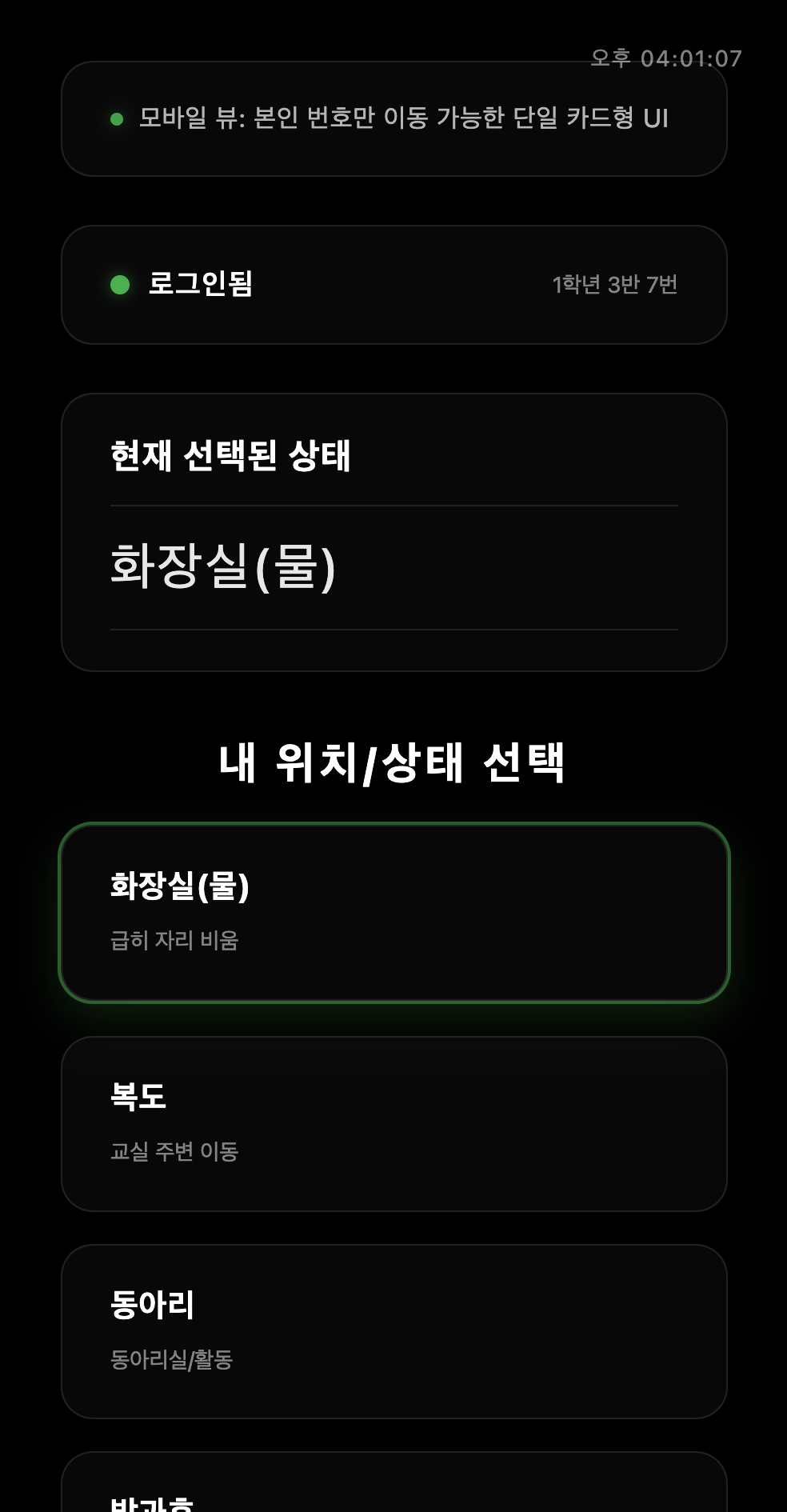 전자칠판에서 자석을 끌어다 영역으로 넣거나, 핸드폰에서 자신의 상태를 체크하기만 하면 끝.