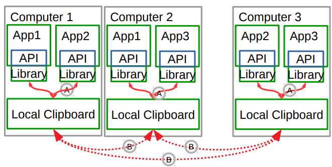 Every time data is copied to a local clipboard that data should be replicated to all other clipboards. For instance, in the previous example data that is copied to the Clipboard3 should be replicated to the other 3 clipboards: