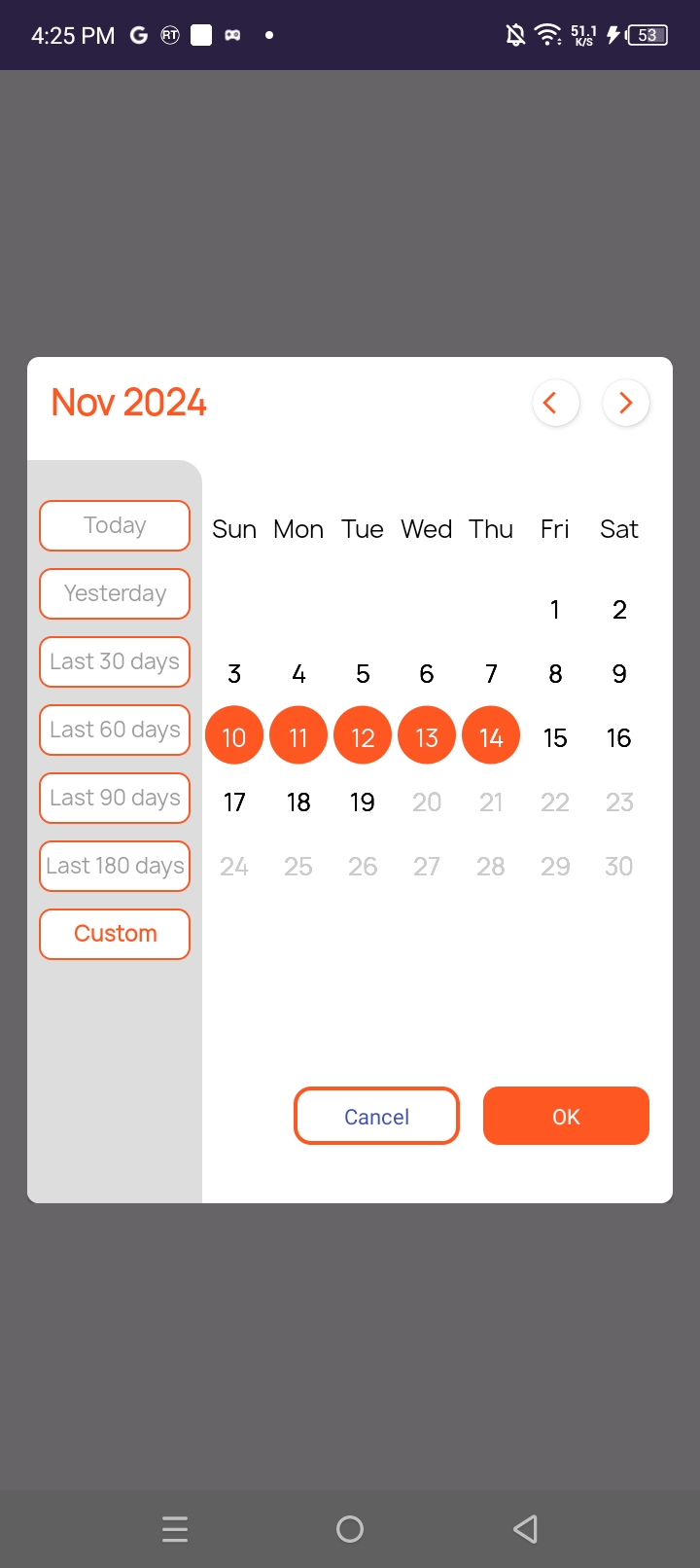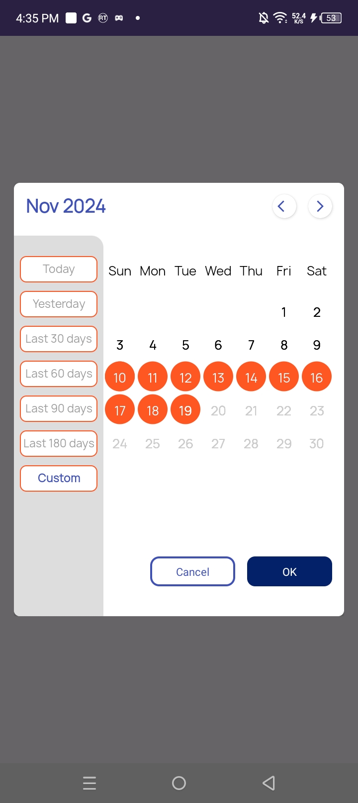 val (startDate, endDate) = calendarDialogBinding.customCalendarView.getLastXDays(30) //used to get last 30 days dates just pass 30 as parameter to this method