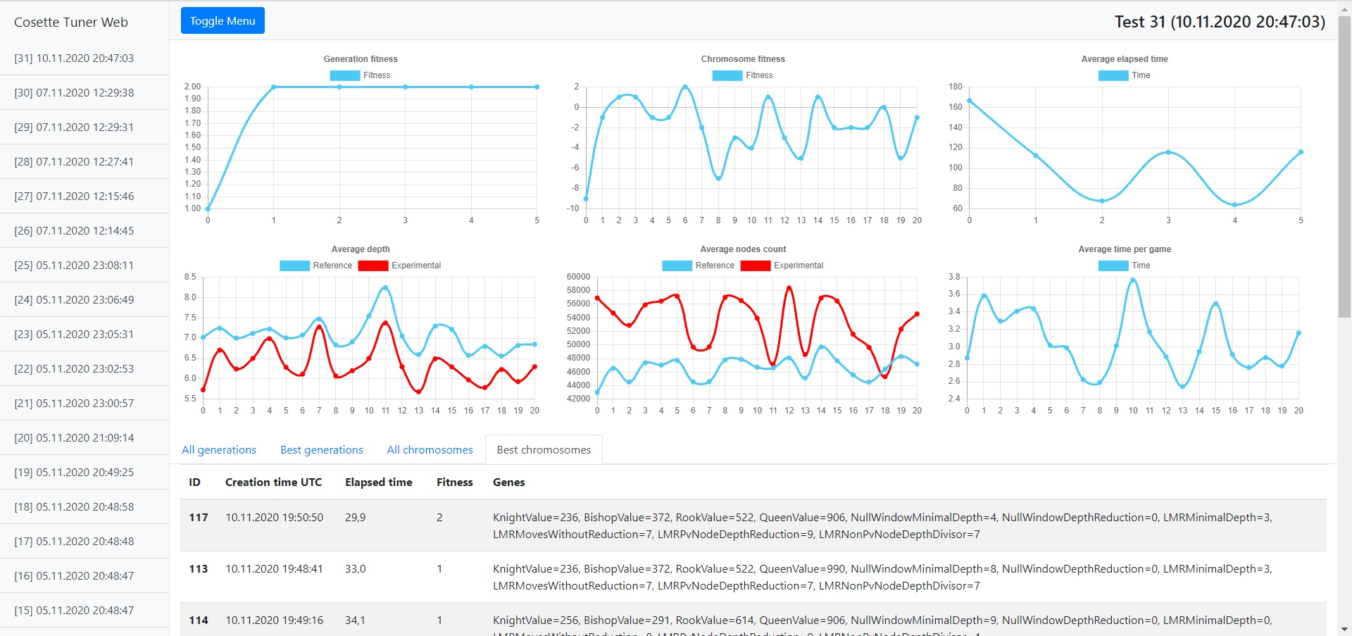 A set of console applications (selfplay + Texel) and web interface, which allows adjusting engine parameters using standard UCI command setoption. Results are displayed on the local website using a set of tables and charts.