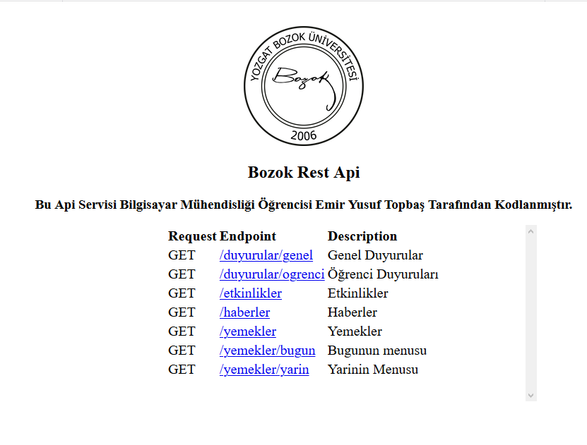 BozokAPI is a web service that fetch data from bozok.edu.tr and gives us that data using json format.
