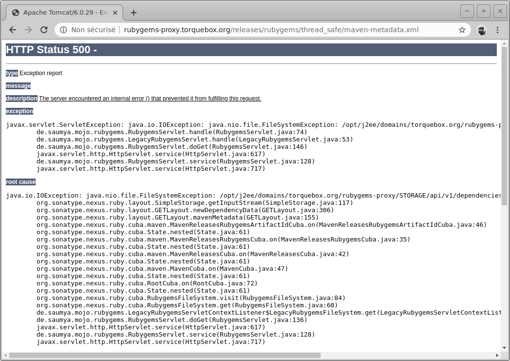 javax.servlet.ServletException: java.io.IOException: java.nio.file.FileSystemException: /opt/j2ee/domains/torquebox.org/rubygems-proxy/STORAGE/api/v1/dependencies/thread_safe.ruby: Read-only file system