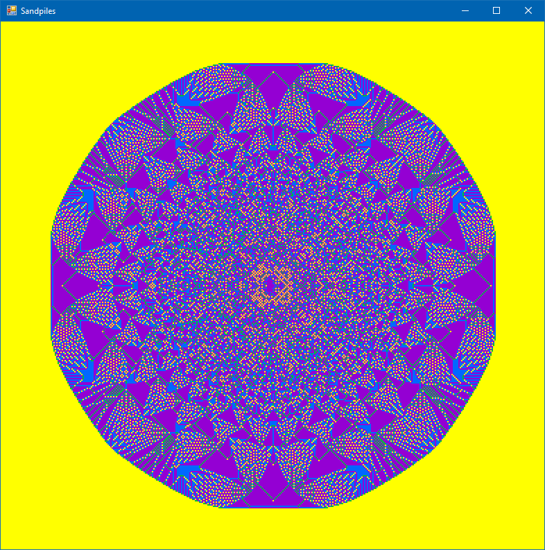 Algorithm implemented from Wikipedia's sandpile article as seen on The Coding Challenge #107: Sandpiles.