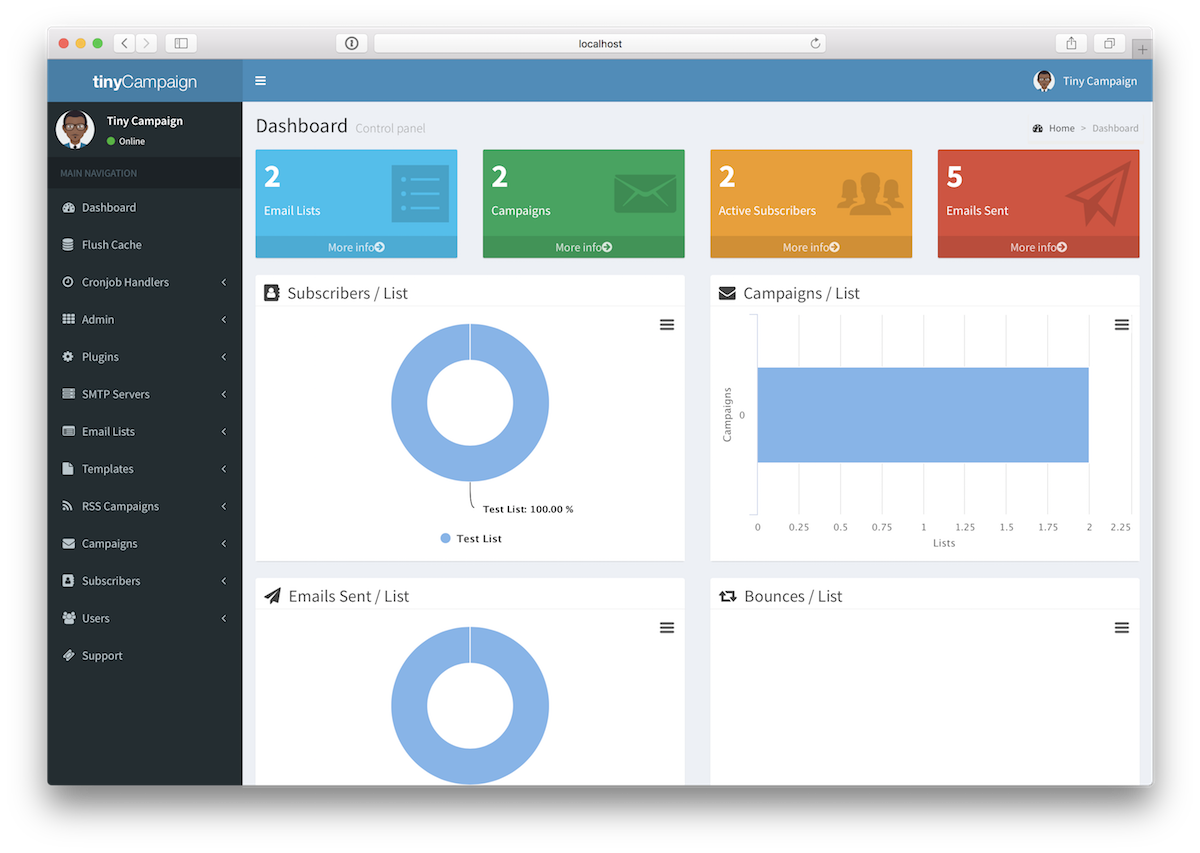 tinyCampaign is a simple and lightweight newsletter system built on a nice Bootstrap and the Liten framework. You can send out simple and beautiful HTML emails with ease. You must use an SMTP account in order to send out emails. This is to help reduce spam as well as to better identify spammers abusing the system.