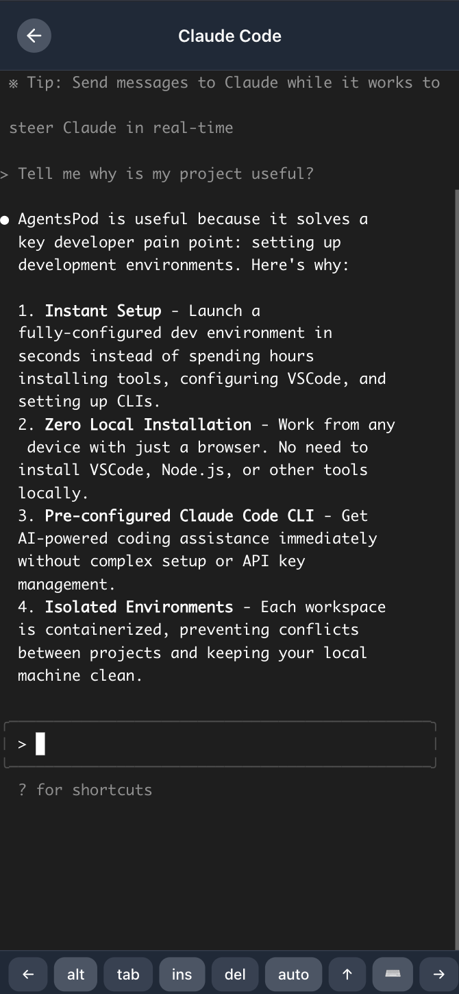 Launch on-demand development workspaces with VSCode and Claude Code CLI pre-installed. Code with AI assistance from anywhere, even your phone.