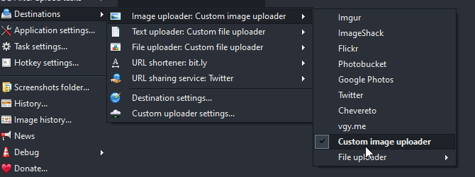 Next, in destinations, set your image uploader and file uploader to "Custom image uploader" After that click on custom uploader settings. Go to import and import the sxcu provided in the repository from the file.