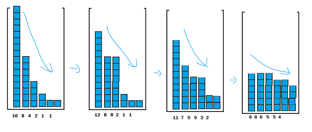 The spikiest distribution is unstable as the water level is uneven, and since water only flows downward, every valid distribution is generated as the water comes to rest at the most even state.