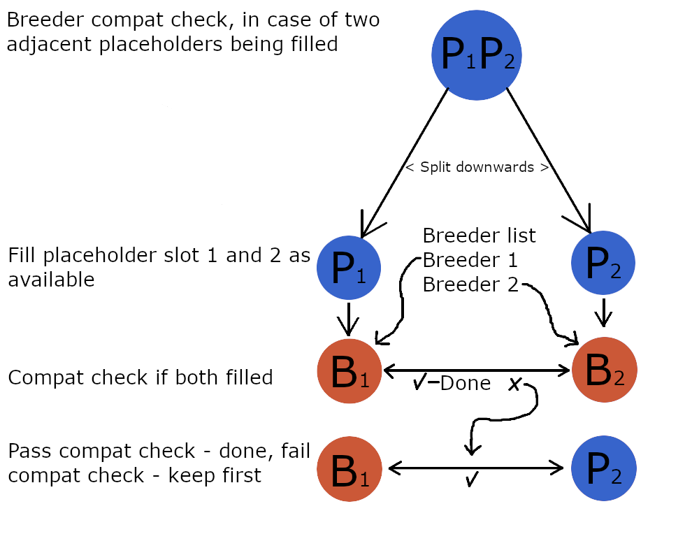 If splitting a slot from above results in two potential breeders below, they are evaluated for compatibility, and if they are not compatable the second breeder is replaced with a placeholder.
