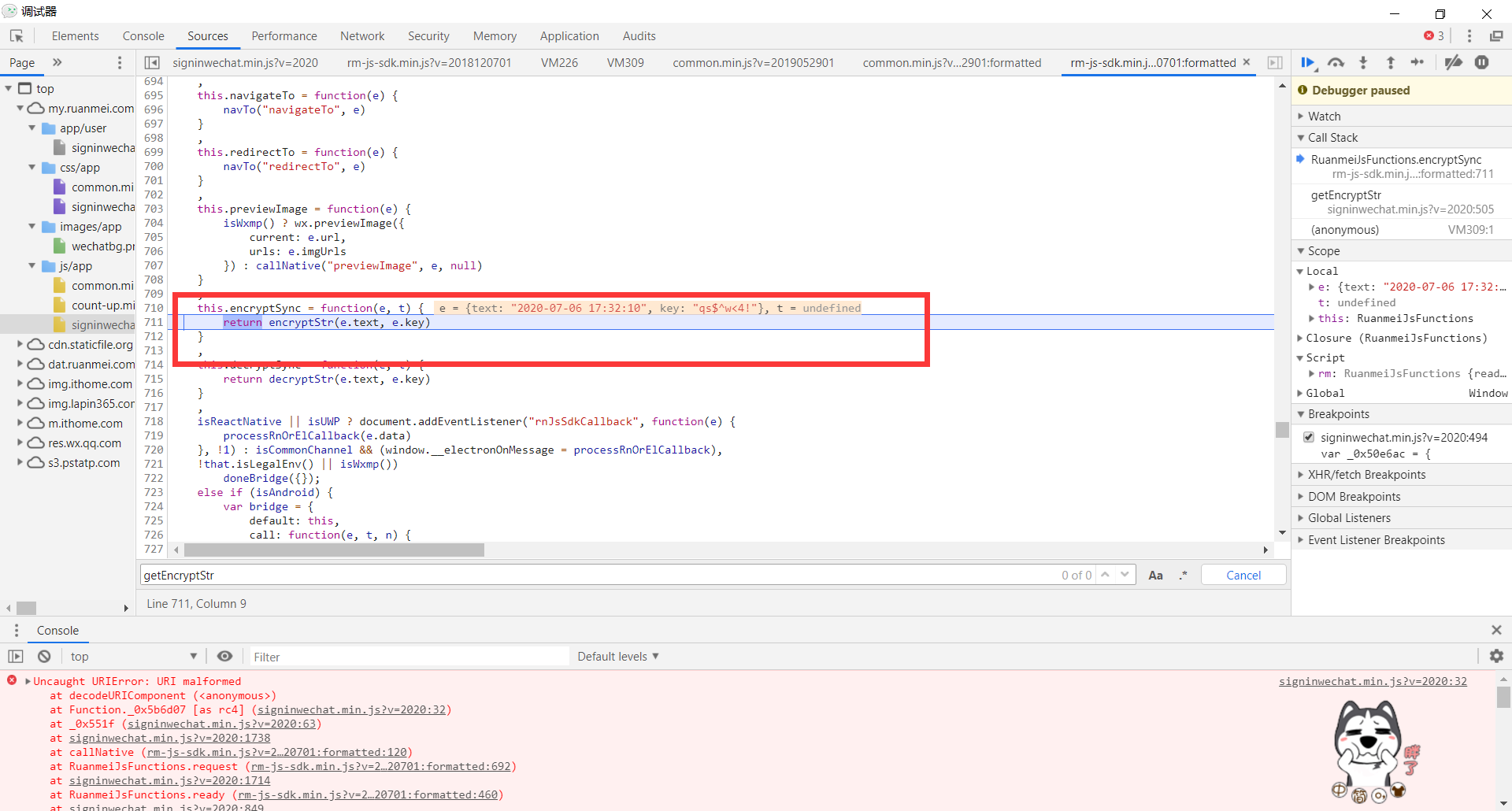 调试和前端调试一样,控制台输入函数名getEncryptKey()输出qs$^w,那这个去解密发现不对,然后断点逐步调试,终于在一个地方发现正确的密钥。